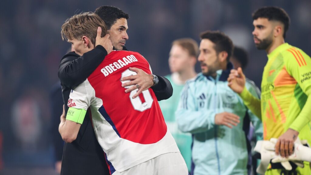 PARIS, FRANCE - MAY 7: Arsenal manager Mikel Arteta consoles Martin Odegaard of Arsenal during the UEFA Champions League 2024/25 Semi Final Second Leg match between Paris Saint-Germain and Arsenal FC at Parc des Princes on May 7, 2025 in Paris, France. (Photo by Mark Leech/Offside/Offside via Getty Images)